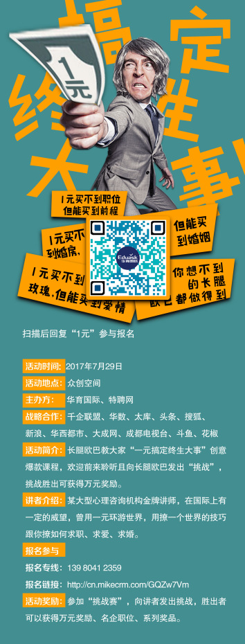 原来我们都被套路了!这件事从头到尾就是一个广告呀!好在这位长腿哥长的还不赖,而他说的那些“终生大事课程”听起来也蛮有趣的,反正票价也很便宜,只要1元,小编为你们找到了通道,要去的戳这里http://cn.mikecrm.com/GQZw7Vm(快速报名通道)