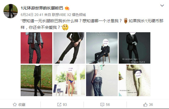 这位男神最初以腿长走红,他自称长腿欧巴,还宣称一元钱环游世界。观其微博,字里行间透露着他对长腿的看法和对一元钱独特的观点。从一元钱环游世界,到一元钱变走成都妹子,再到用一元钱搞定终身大事,长腿与一元到底有什么关系?这个男子如此动作到底有什么目的?让我们一一揭晓答案。