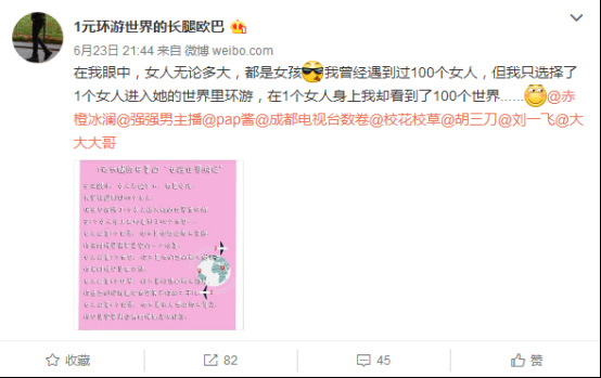 首先要说的是一元环游世界,此事真假未知,但从他写的游记中可以看出,他对每个地方的特点相当了解,都用一个关键词来形容。除了这条微博,还有一条微博称自己遇见过100个女人,对女性相当了解,配图中的文字处处为女性说话,从而俘获大批女粉丝的心。后来还提到可能会到成都,并且还要用一元钱变走成都妹子。